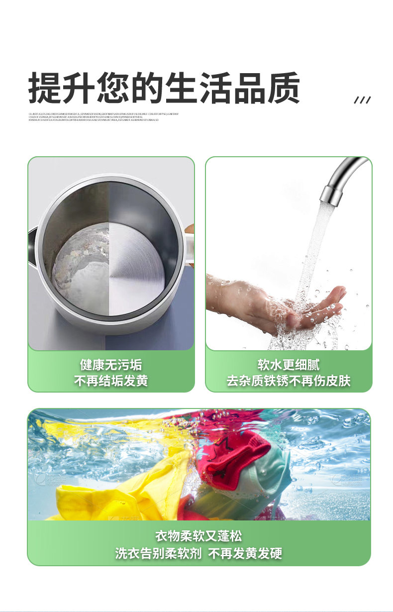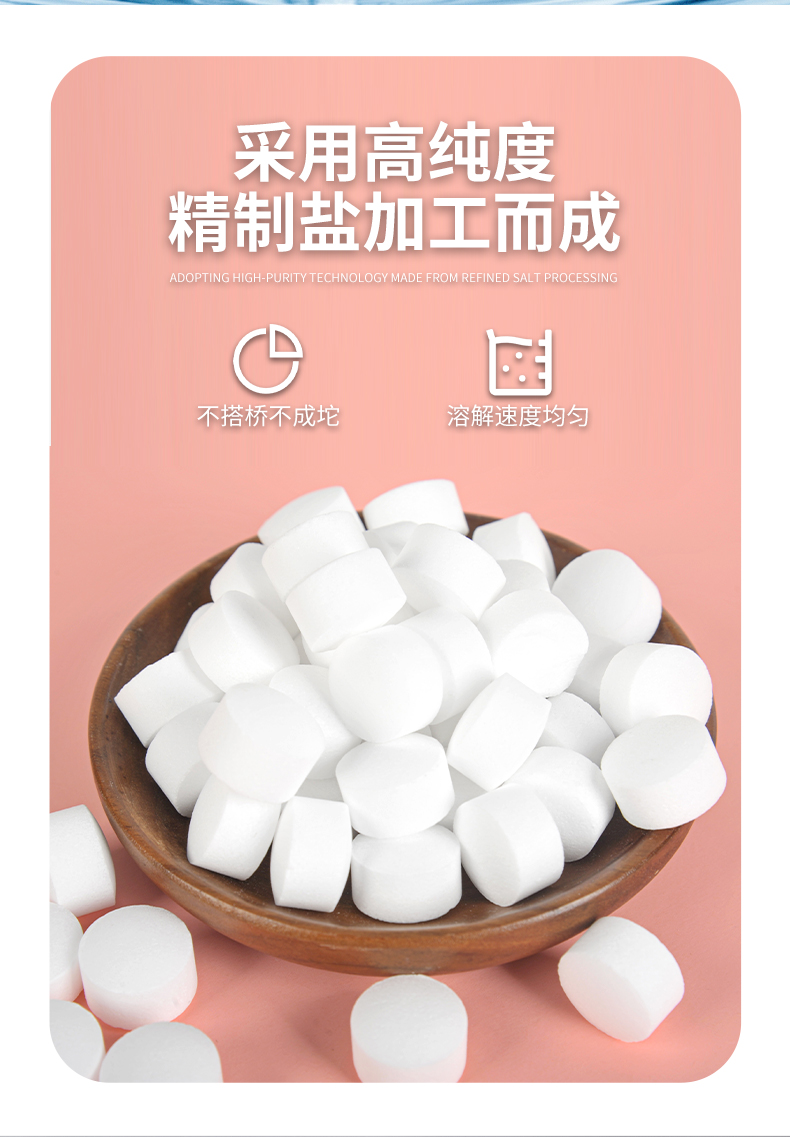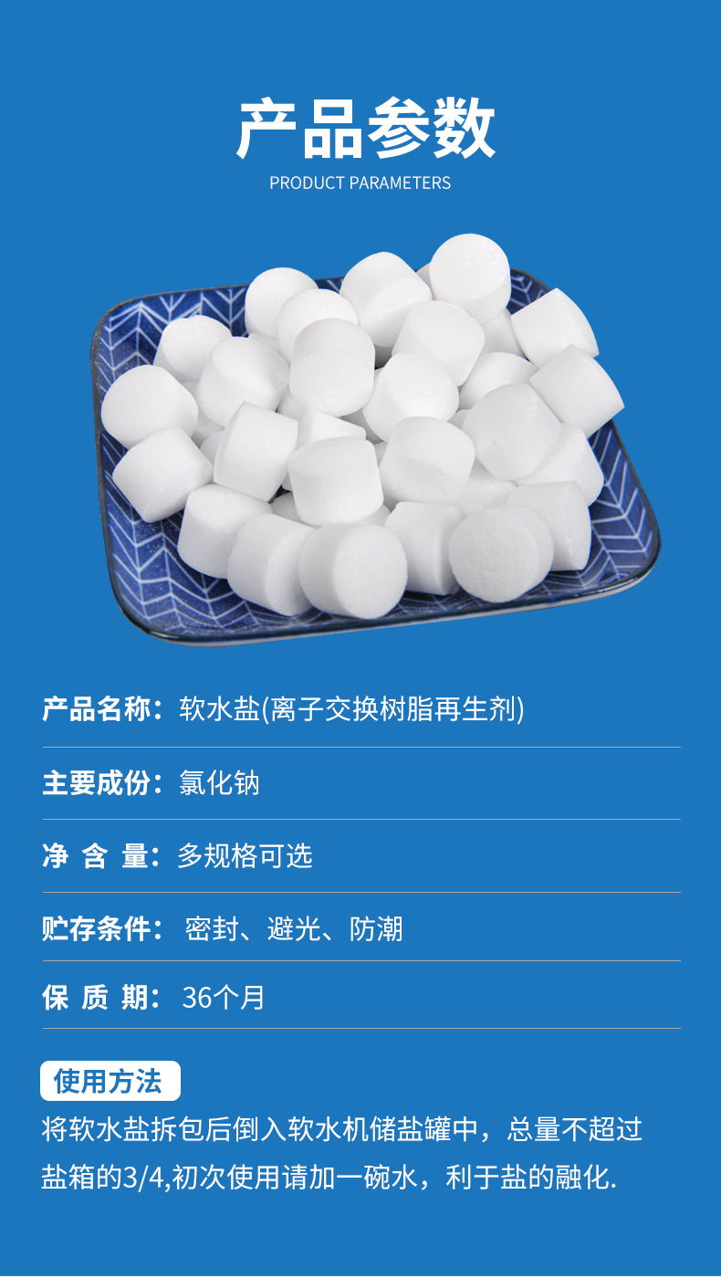使用方法:將軟水鹽拆包后倒入軟水機儲鹽罐中,總量不超過鹽箱的3/4,初次使用請加一碗水,利于鹽的融化。